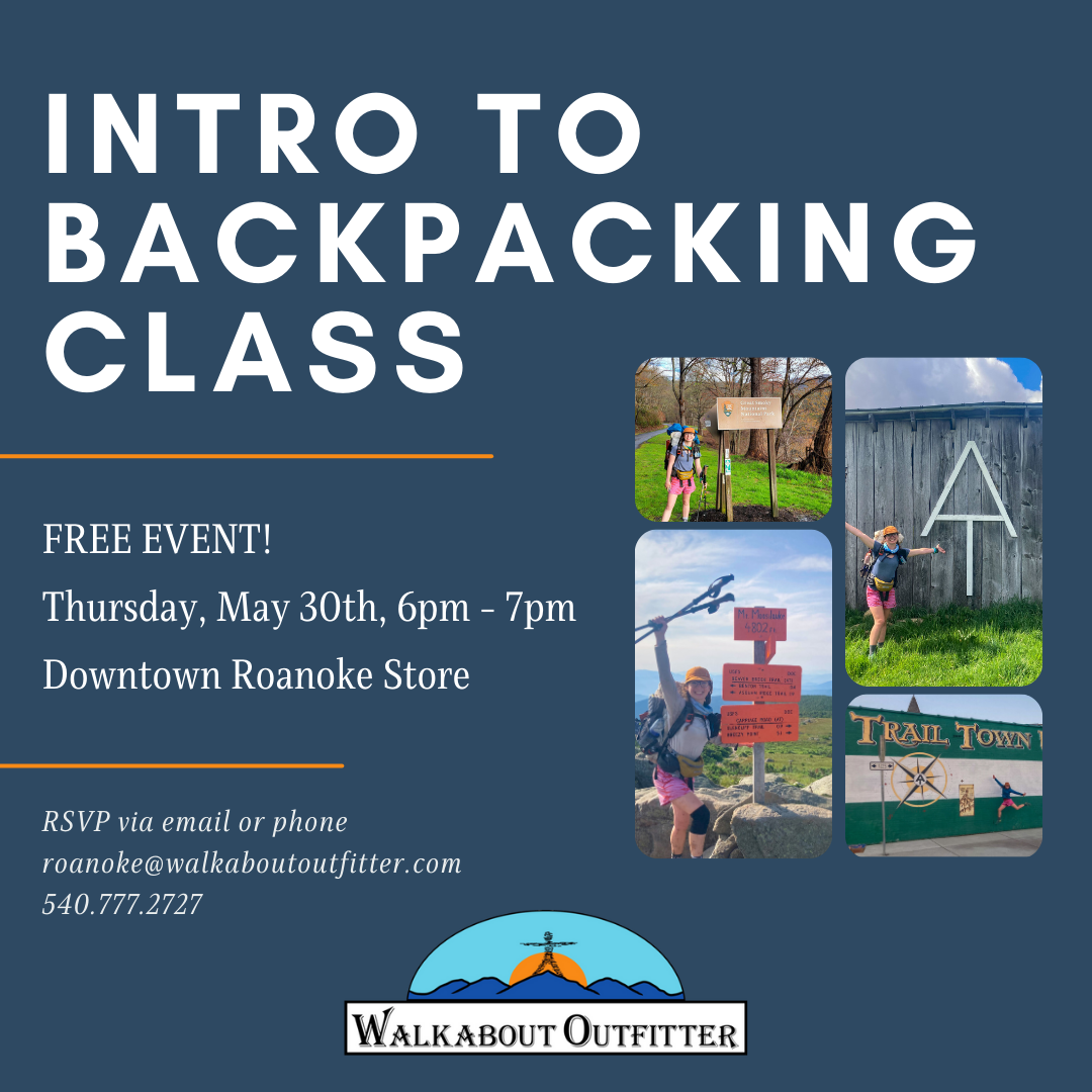 Interested in backpacking but don’t know where to start? Walkabout has you covered! Kimberly (trail name Dex) is hosting an introductory backpacking presentation at our Downtown Roanoke Store. Kimberly recently thru-hiked the Appalachian Trail and has been working at Walkabout since she finished. Come find out what equipment, skills, and tricks make it possible to go backpacking and have fun while doing it!