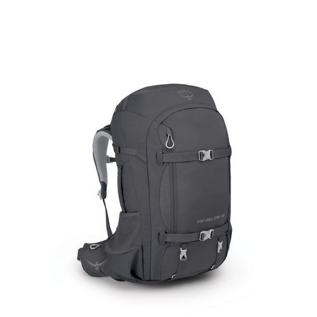 Planning a trip with a lot of trail time built in? Then plan to bring along the Fairview Trek 50, a hybrid solution designed for women who travel far and wide and don't stop moving when they get there. Whether you're touching down in Cusco or Kilimanjaro, travel-specific features-like a protective pack cover and internal compression straps with fabric wings-will help your belongings arrive intact. Adjustable backpacking suspension and ventilation keep you comfortable and cool when you're covering ground in even the most tropical of climates. A sizable zippered front panel makes it easier than ever to load and unload your gear, no matter if you're taking in ancient ruins or trekking Africa's tallest mountain. A hydration sleeve, hipbelt pockets and sleeping bag straps round out on-the-trail essentials. And that protective travel AirCover doubles as a waterproof raincover in stormy weather. The Fairview Trek is compatible with our Daylite packs for times when an additional smaller bag is necessary.