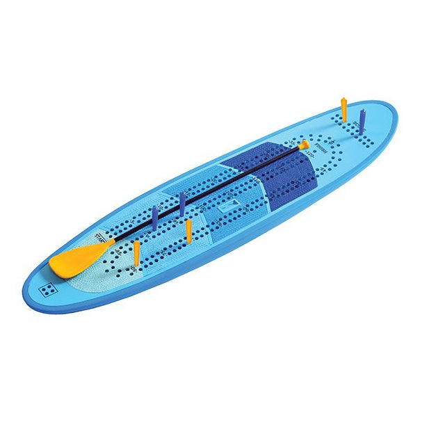 Enjoy family cribbage nights in elegant, outdoor inspired style with this Stand Up Paddle Board Cribbage Board. Hand painted with attention to every detail, the Stand Up Paddle Board has become a symbol of healthy outdoor living. With 6 color-coded plastic pegs included and a built-in storage compartment underneath, this board is sure to make a great conversation piece.